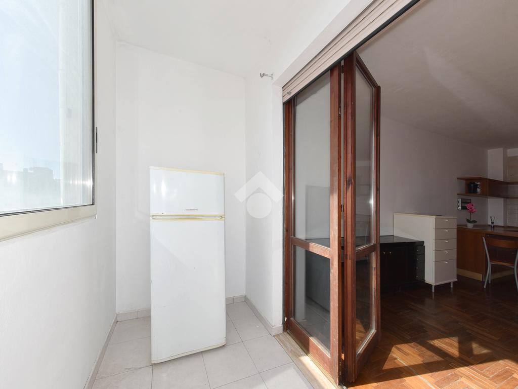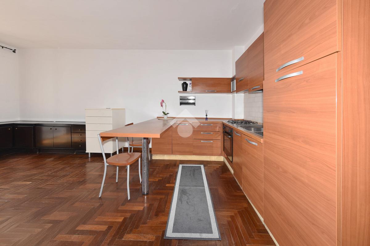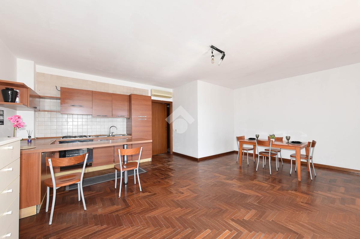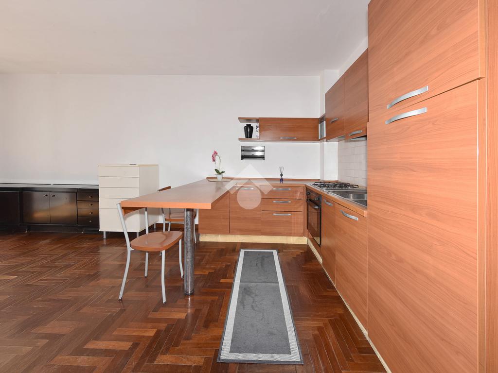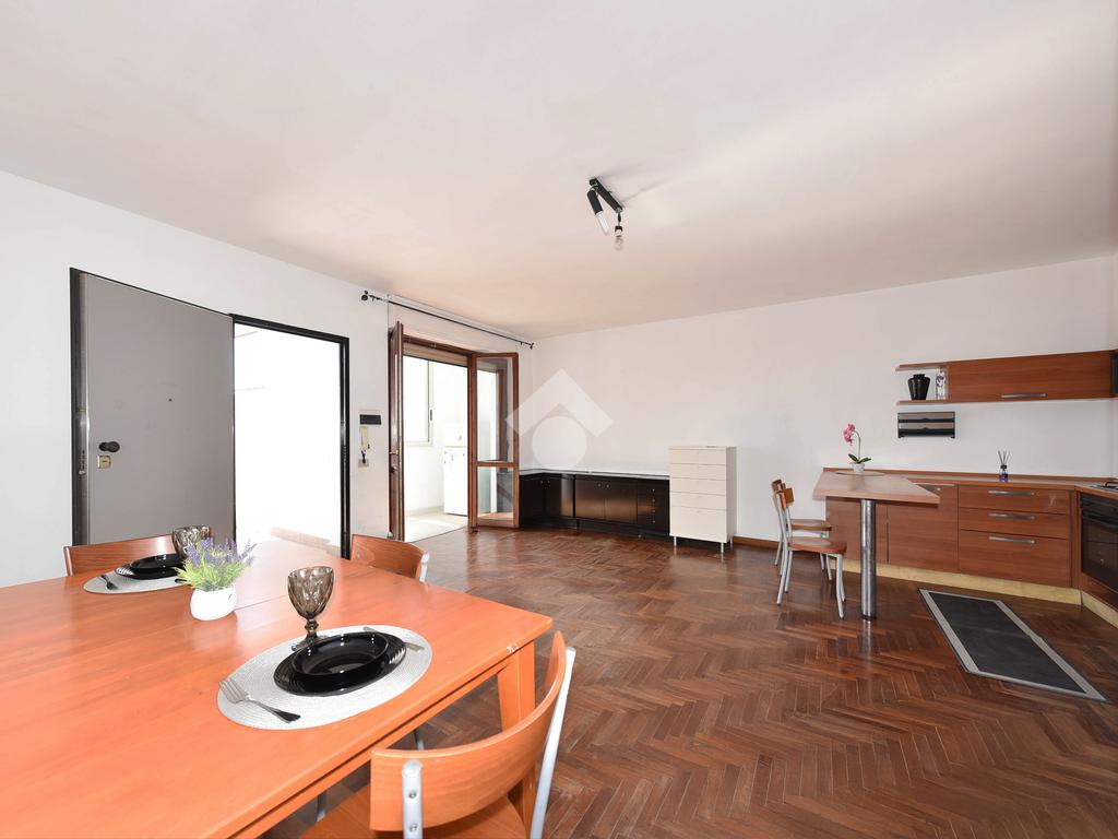 L'ingresso si apre su un soggiorno open space con angolo cottura che affaccia su una comoda veranda chiusa