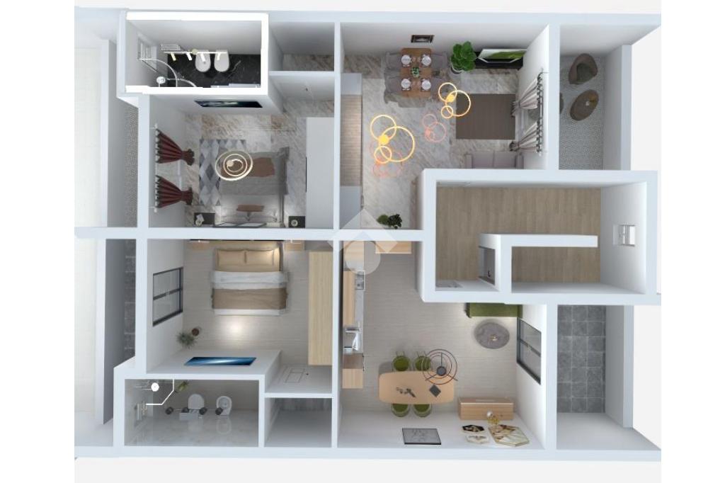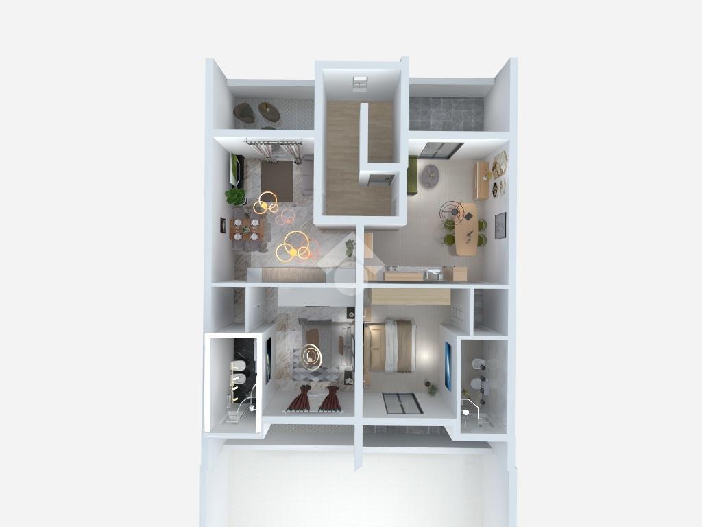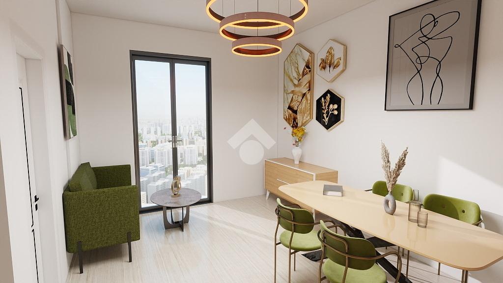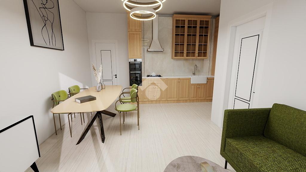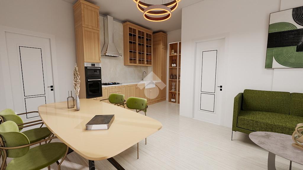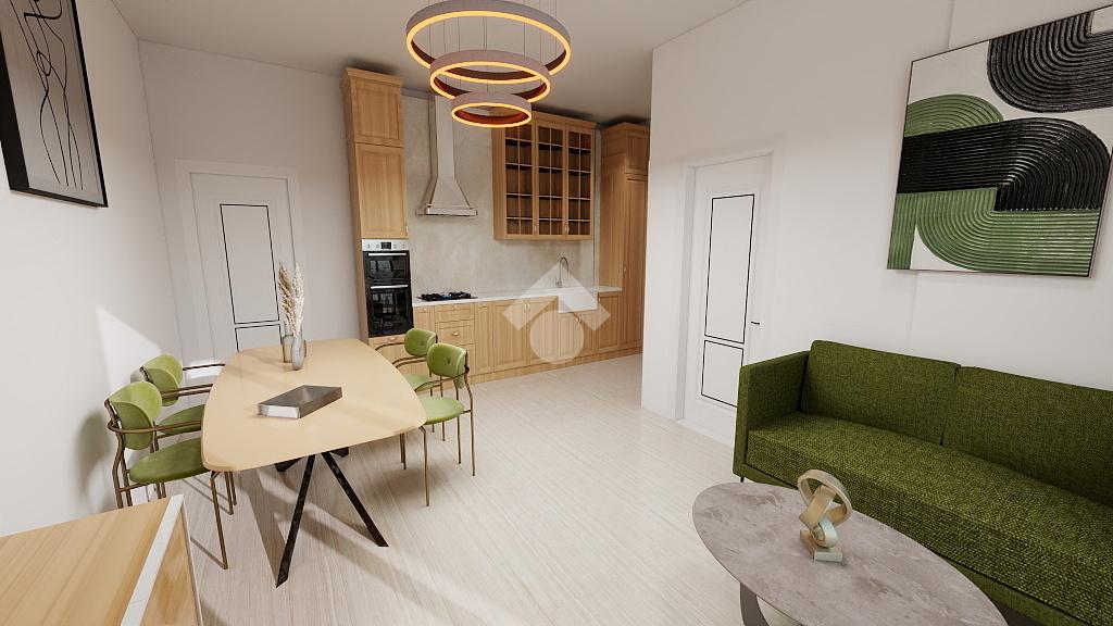 All'interno, l'appartamento dispone di un luminoso soggiorno con angolo cottura con predisposizione per piano a induzione, che si affaccia su un'ampia veranda tramite una porta finestra.