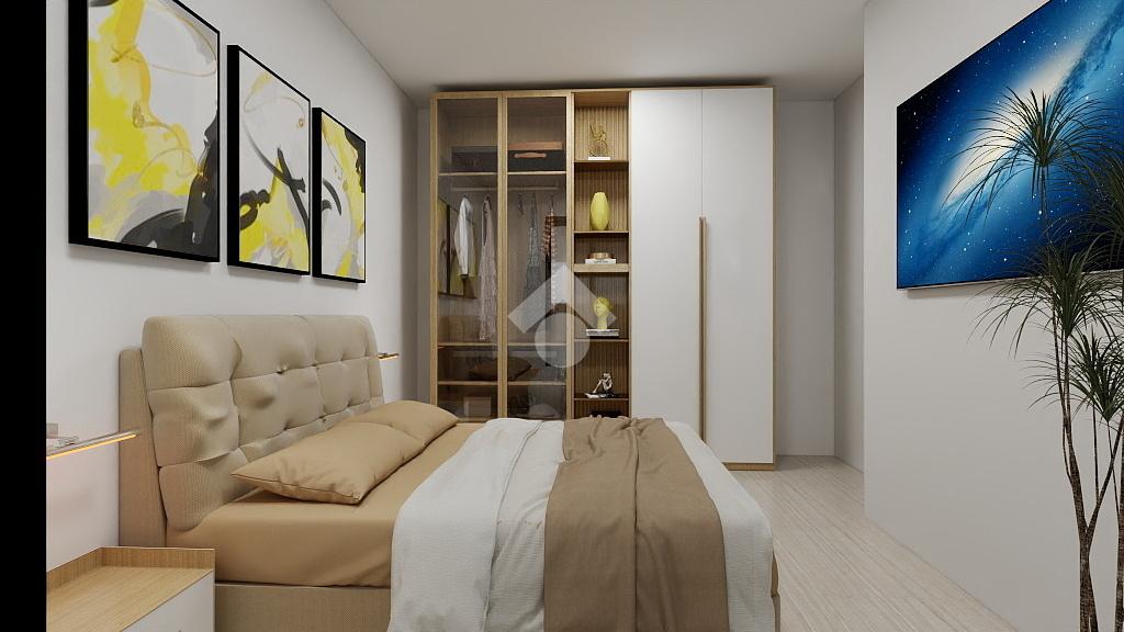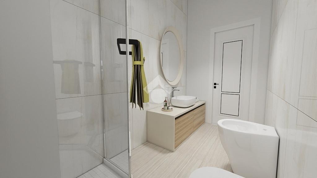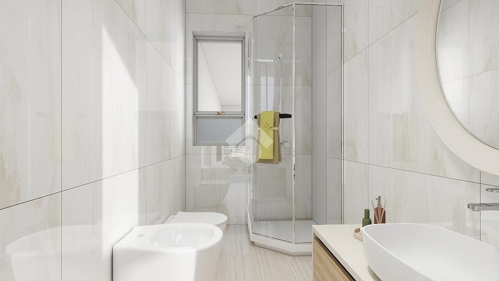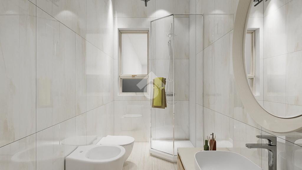 Proseguendo, un disimpegno conduce al bagno, completo di un box doccia e sanitari sospesi e alla camera da letto matrimoniale.