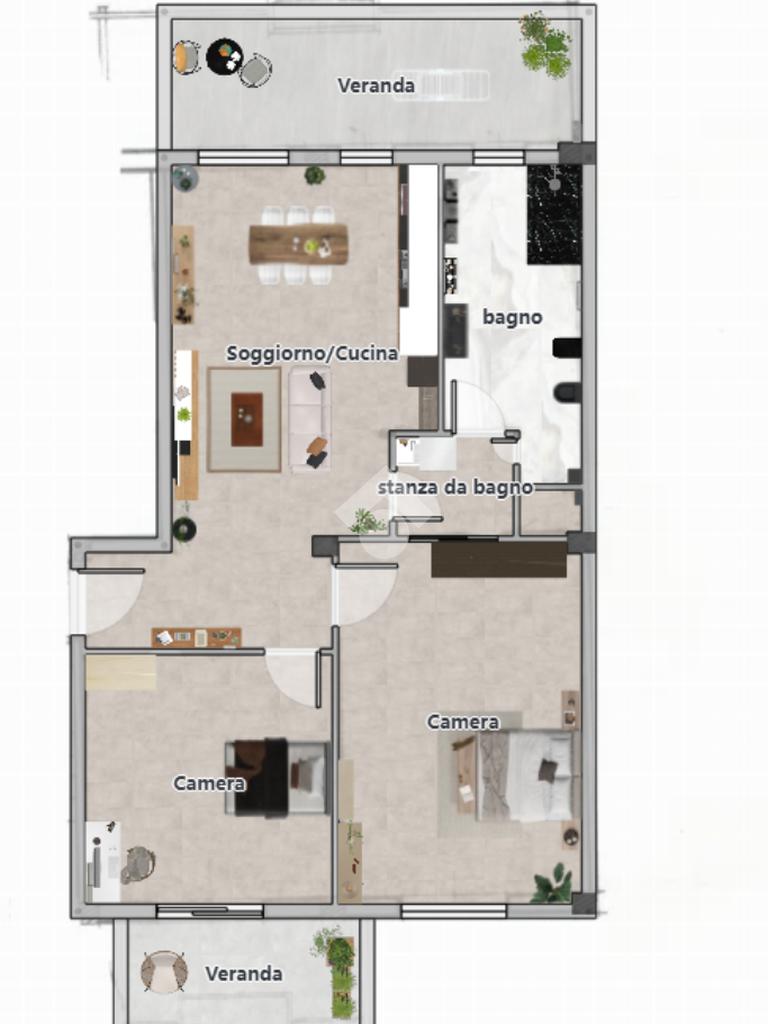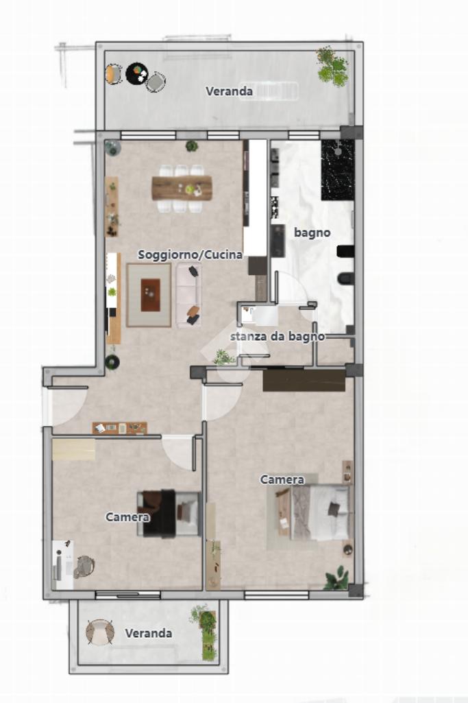 L'ingresso si apre su un soggiorno open space con angolo cottura che affaccia su una comoda veranda